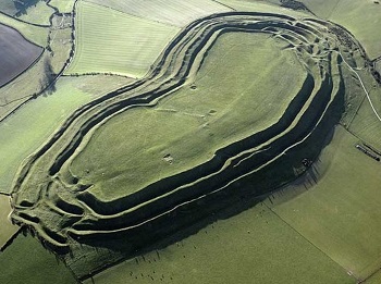 Maiden Castle, near Dorchester, in Dorset, is the largest developed hillfort in Britain. In the Neolithic, there had been a ‘causewayed enclosure’ at the eastern end (bottom-left in the aerial photo) of the site, and then a large ‘bank barrow’ (about 545 metres by 19 metres) had been erected, running east–west across the centre of the hill.[*] Around 600 BC, more or less on top of the old causewayed enclosure, a univallate, ditch and rampart (utilising dump and timber-revetted box rampart techniques), hillfort was built.[*] Between c.400 BC and c.100 BC, the hillfort underwent several phases of development, to produce the massive glacis ramparts and complex entrances which are still impressive today. The enclosed area of the developed hillfort, over 17 hectares, is almost triple that of the original fortification, and the overall size of the site is in excess of 45 hectares. Sir Mortimer Wheeler excavated at Maiden Castle in the mid-1930s. Based on his findings, Sir Mortimer produced a famously dramatic description of Maiden Castle’s fall to the Romans, led by, the future emperor, Vespasian, in their westward advance after the invasion of AD 43. Further excavation, by Niall Sharples, took place in the mid-1980s, and a new appraisal of the evidence suggested that, by the time the Romans arrived, the hillfort had already outlived its usefulness – its defences were neglected and its population was much-reduced.[*] What seems clear, however, is that Maiden Castle was finally abandoned within a few decades of the Roman conquest. A small Romano-British temple was built within the interior in the late-4th century AD.[*]