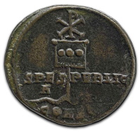 (•)A bronze coin of Constantine, minted at Constantinople c.327, depicting a ‘labarum’ – as a standard bearing the Chi-Rho is called – spearing a serpent.[*]
