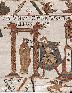 To receive the oath, he [William] caused a parliament to be called. It is commonly said that it was at Bayeux that he had his great council assembled. He sent for all the holy bodies [i.e relics] thither, and put so many of them together as to fill a whole chest, and then covered them with a pall; but Harold neither saw them, nor knew of their being there; for nought was shewn or told to him about it; and over all was a reliquary, the best that he could select; ‘bull’s eye’ [oil de boef], I have heard it called. When Harold placed his hand upon it, the hand trembled, and the flesh quivered; but he swore, and promised upon his oath, to take Ele [William’s daughter] to wife, and to deliver up England to the duke: and thereunto to do all in his power, according to his might and wit, after the death of Edward, if he should live, so help him God and the holy relics there! Many cried “God grant it!” and when Harold had kissed the saints, and had risen upon his feet, the duke led him up to the chest, and made him stand near it; and took off the chest the pall that had covered it, and shewed Harold upon what holy relics he had sworn; and he was sorely alarmed at the sight.The name of the daughter of Duke William betrothed to Harold is not supplied by William of Poitiers. In Historia Ecclesiastica Book V, Orderic Vitalis names her Agatha, but he had previously called her Adeliza. Guernes of Pont-Sainte-Maxence calls her Rainild. William of Malmesbury did not know her name, but notes (GR II §228) she was “then a child”. In a version of these events related by Snorri Sturluson (Heimskringla, ‘Saga of Harald Sigurdsson’ Ch.76), it was “one summer” that Harold was sailing to Bretland, i.e. Wales, when he was driven off course, to Normandy, by a storm (no mention of Ponthieu). Harold enjoyed William’s hospitality, at Rouen, until the following spring (no mention of Brittany or the taking of oaths). Harold, after lengthy consultation with William’s wife (who was “fairer than any other woman that people had seen”), asked William for his daughter in marriage, and William agreed: “but because she was so young, then some winters’ delay was laid down until the marriage date.”Roman de Rou: ii, 113–114