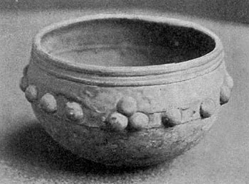 The roundhouses were between 5½ metres and 8½ metres in diameter. The entrances were not on any particular alignment. It seems that some houses must have had solid wooden doors (though none remained), since an iron latch-lifter and “a stone with a pivot-hole” were among the finds. In fact, a vast array of everyday objects were found in and around the village – items of bronze, tin, lead and iron; amber, glass, jet and shale; wood, bone and antler; pottery, baked-clay, flint and stone. Bronze-working and iron-working were carried out on the site. Of the 274 bronze items found, most were “objects of personal adornment”, though the prize find was a bowl.[*] Of the 18 tin objects, the most intriguing was a: