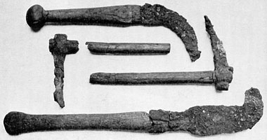 That the inhabitants had iron weapons is certain, for numerous pieces of bronze bordering, and the terminals of three sheaths were discovered.The Lake-Villages of Somerset Fifth Edition (1958) Relics: I