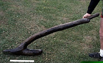 The ard, or ‘scratch plough’, doesn’t cut and turn the soil, but simply gouges the surface. To obtain a good tilth, a field was ploughed in one direction and then cross-ploughed in the other. The ard found at Oakbank (above) is a single piece of oak. At the business end of the ard (left in the photo) is a tang, which could have held a ‘share’ made of iron. The introduction of the iron share allowed heavier soils to be cultivated.