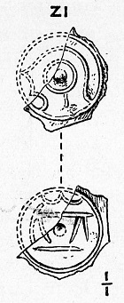Among the “very numerous” objects made of baked-clay were loom weights and spindle whorls, pieces of two tuyères (used to conduct the blast of air from bellows into the furnace), and hundreds of sling pellets. Most of the (in excess of 230) spindle whorls found at the Village were of stone. Also of stone, either whole or fragmentary, were 18 saddle quern components and 38 rotary quern components.[*] A Neolithic polished stone axe-head, and part of a second, were also discovered. These would not have been brought to the Village for practical use, but as curios or objects of reverence. There were also a few flint artifacts.