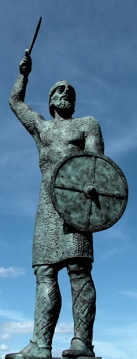 Byrhtnoth’s men are facing a Viking army across a tidal river – the Pante (now the Blackwater). A Viking spokesman (none of the Vikings are named) calls across the water. He demands tribute, saying it would be in Byrhtnoth’s interests to buy peace, rather than to engage in battle. Byrhtnoth replies that he will not give up without a fight, and orders his men to form a shield-wall along the river-bank. At length, the tide recedes, exposing a narrow causeway.